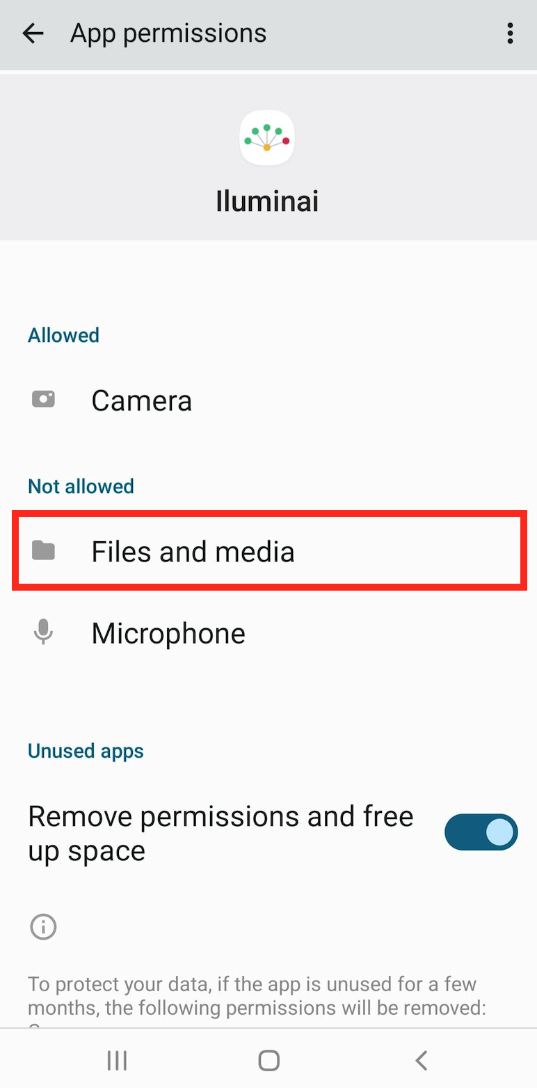 To be able to download PDFs from the Iluminai app onto your phone, you will need to enable access to your Files apps.