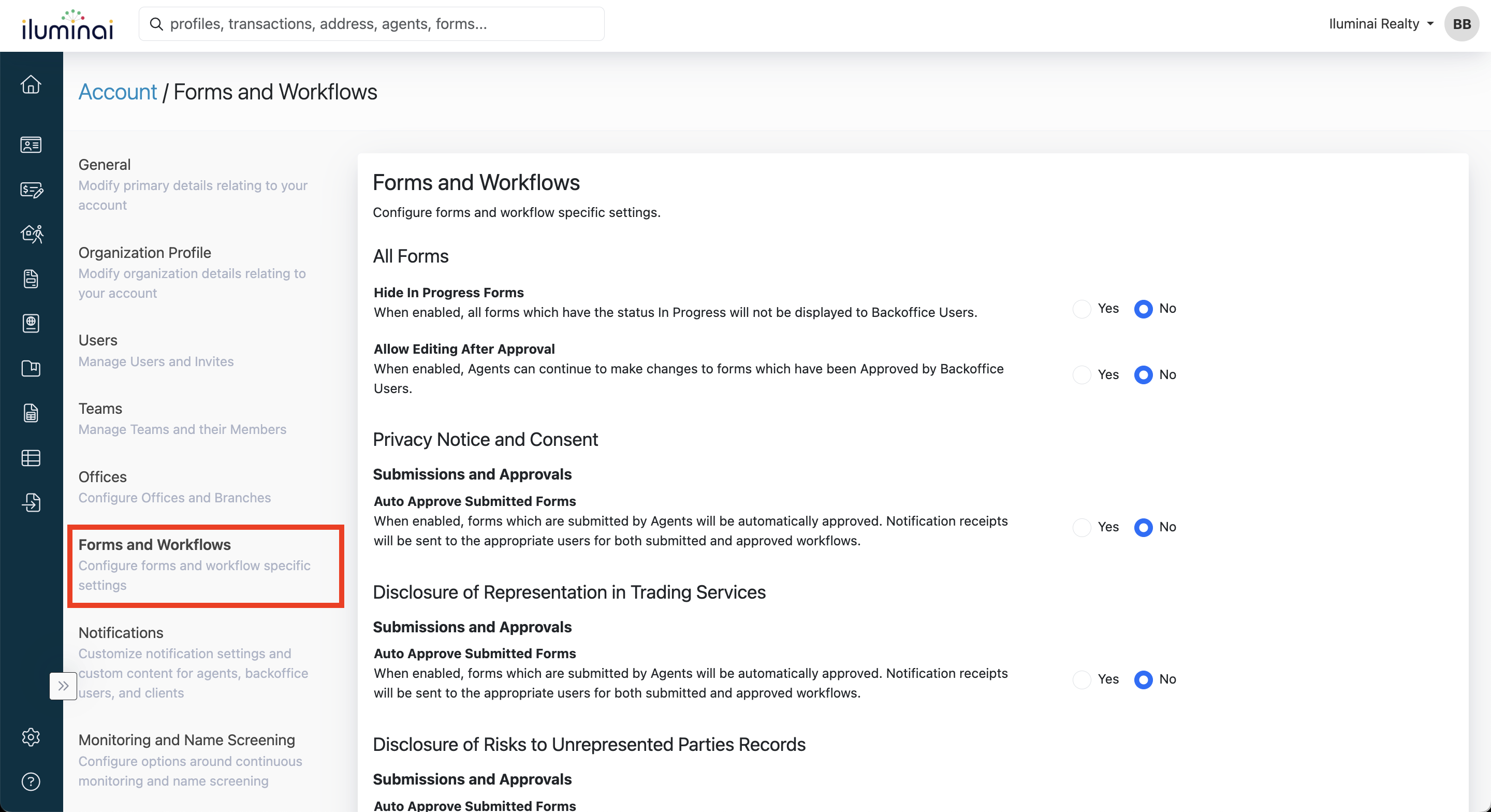 This section allows you to control various aspects about how forms and utilized in your organization.