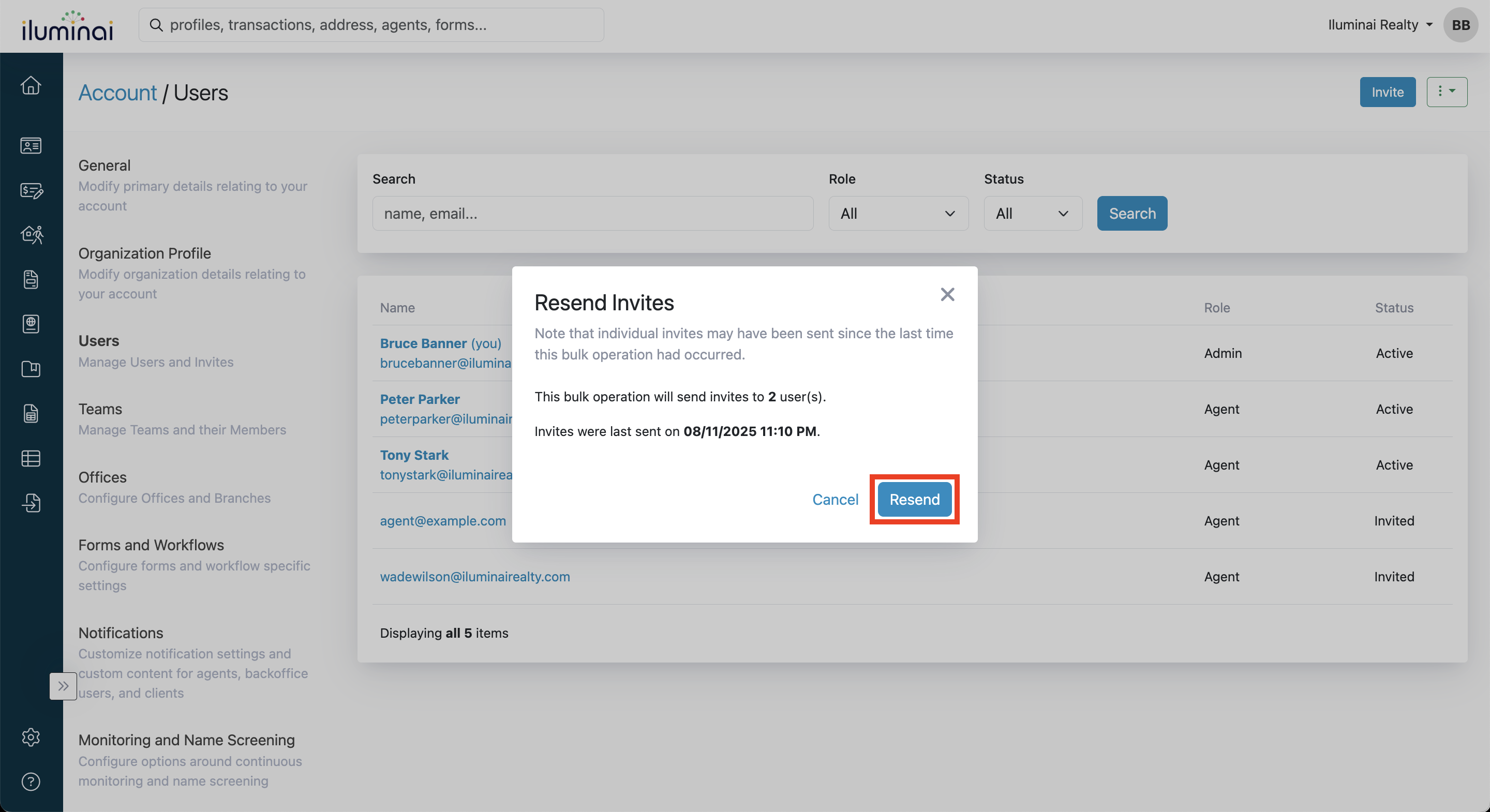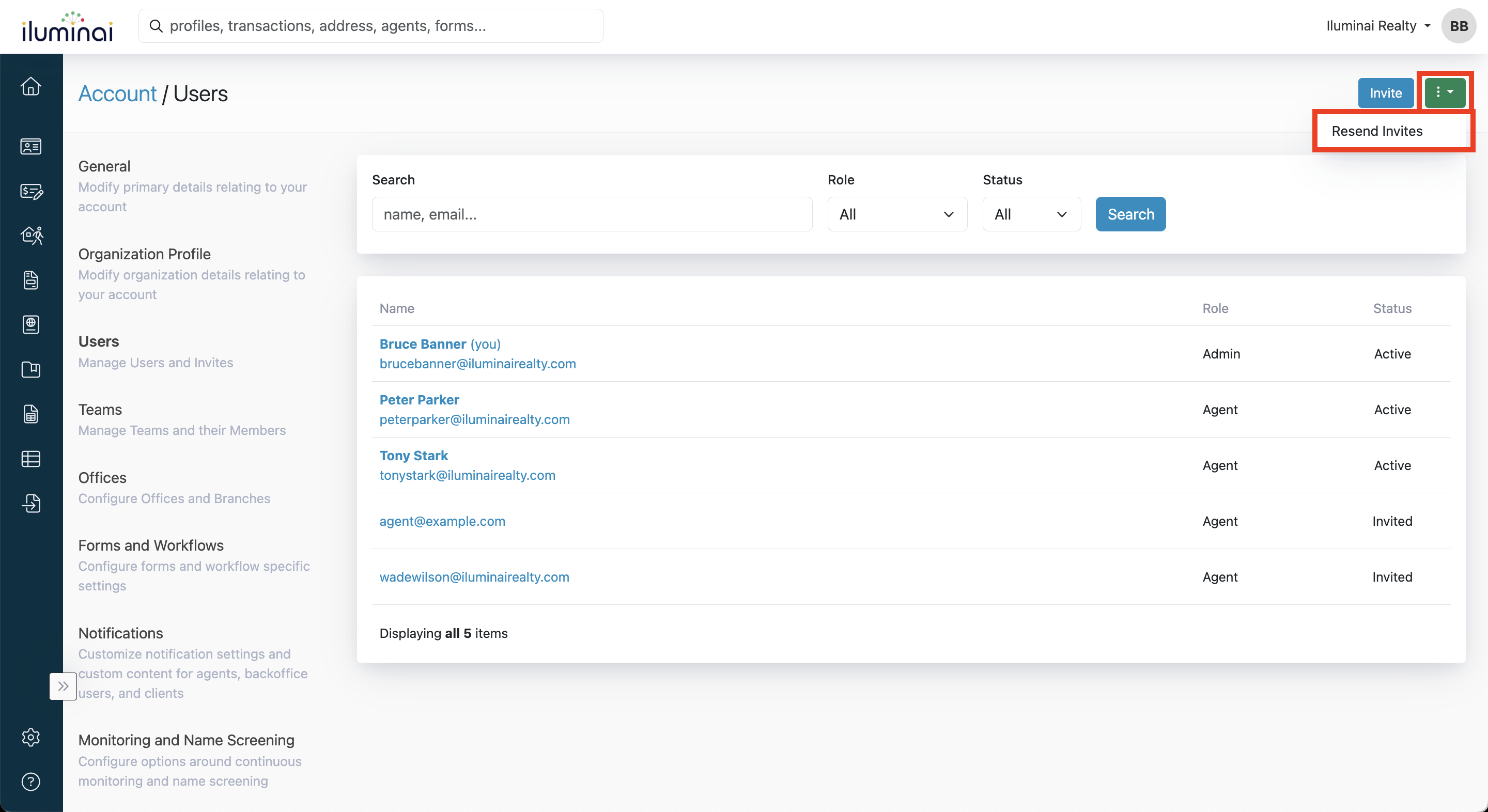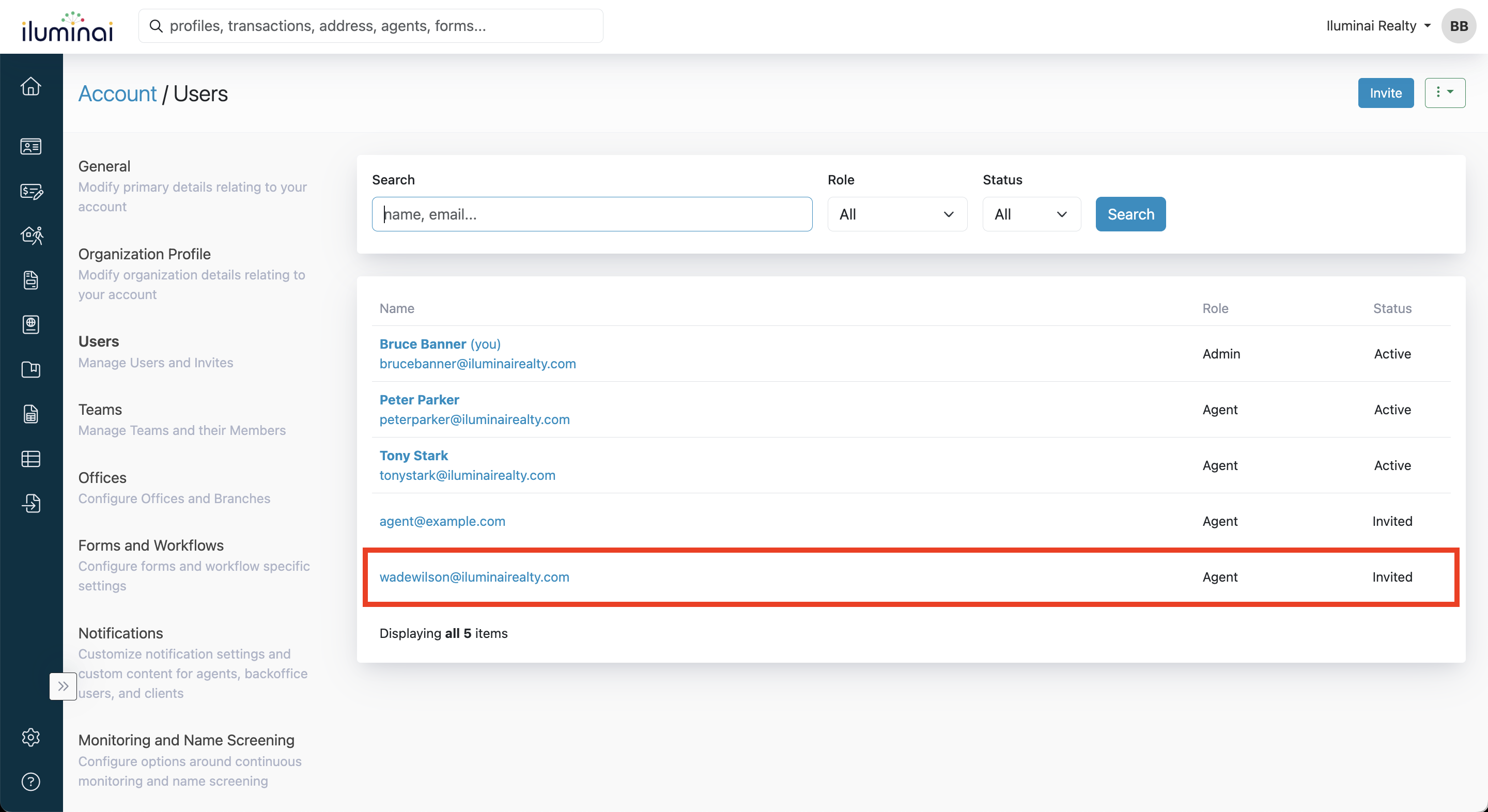 As a Backoffice User with either the Admin or Owner role type, you can invite other users (including Agents) to your Account.