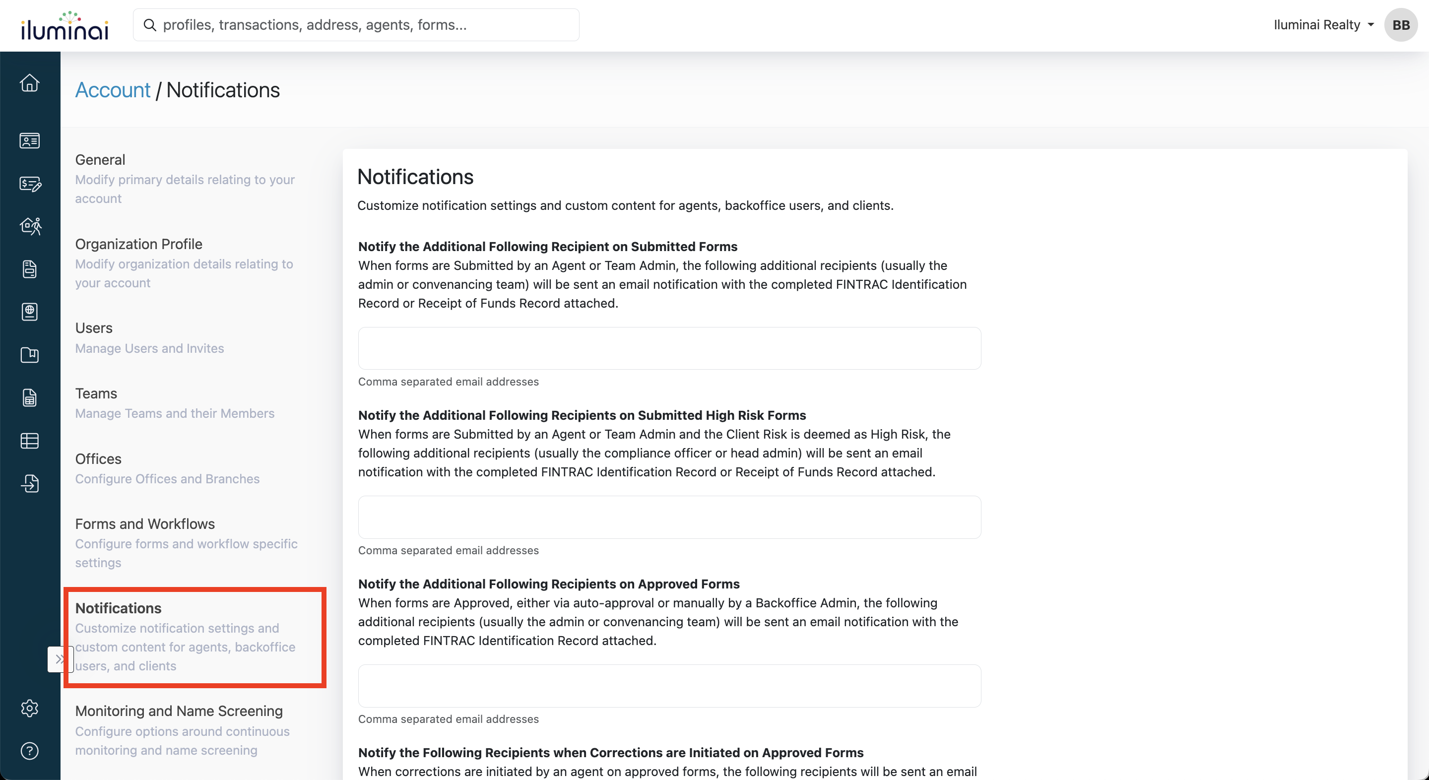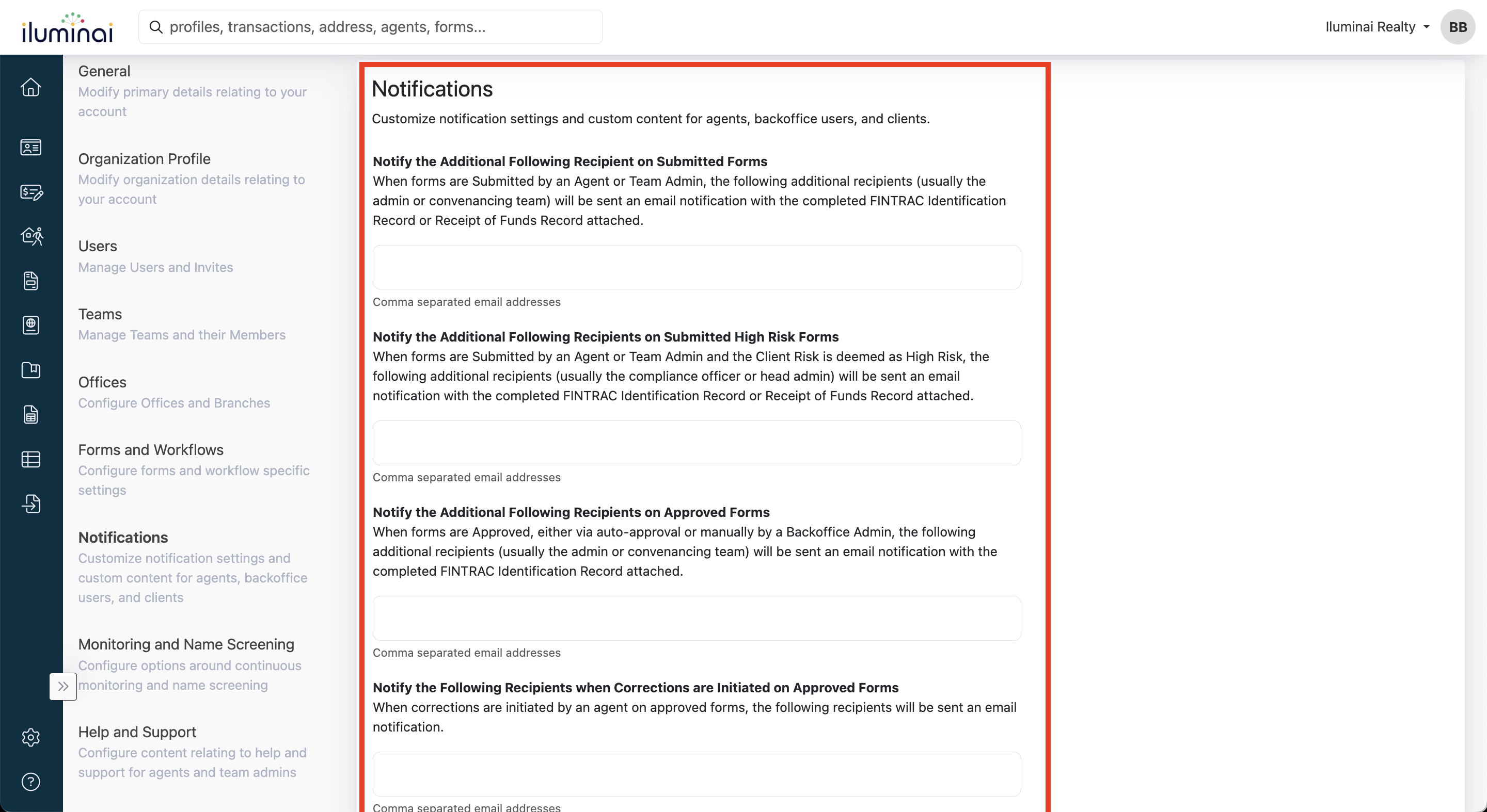 - Under the Notifications section, specify recipients for form-related activities: