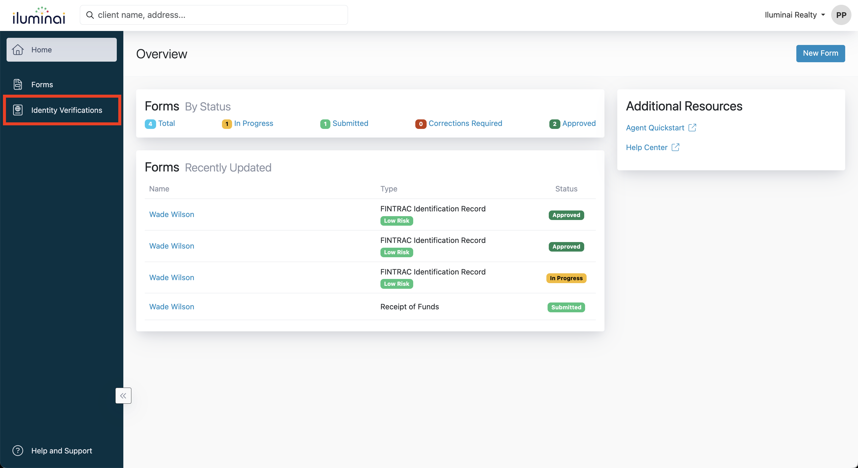 - You'll see the Identity Verifications overview, showing client details, verification methods, statuses, and available actions