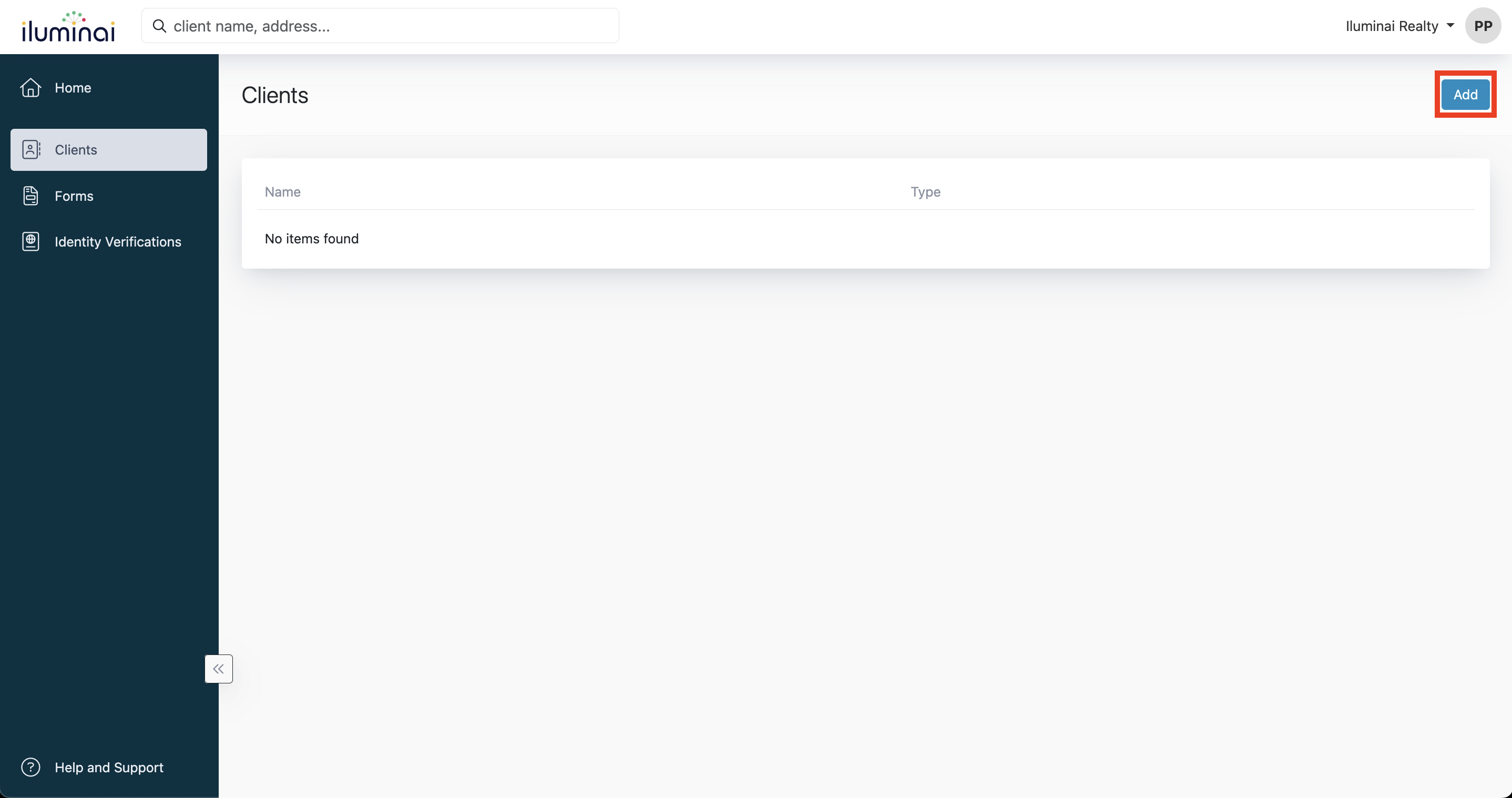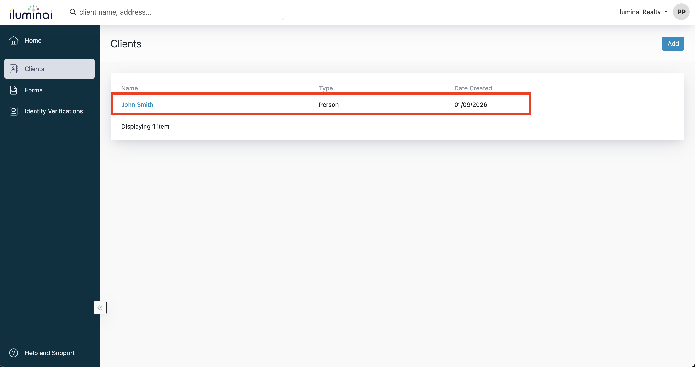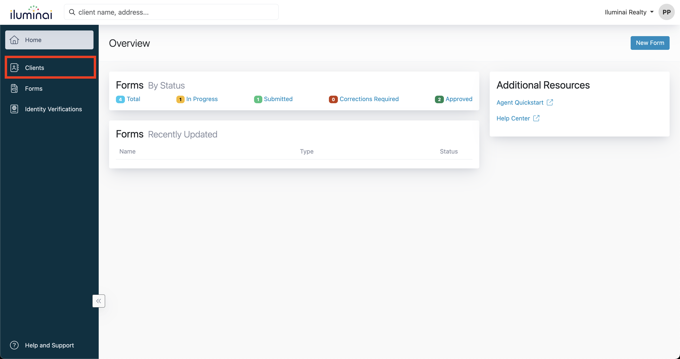 The Client Directory in Iluminai gives Agents a single place to create, organize, and manage Clients, while also keeping clear visibility into which compliance forms are still needed and which have already been completed for each Client.