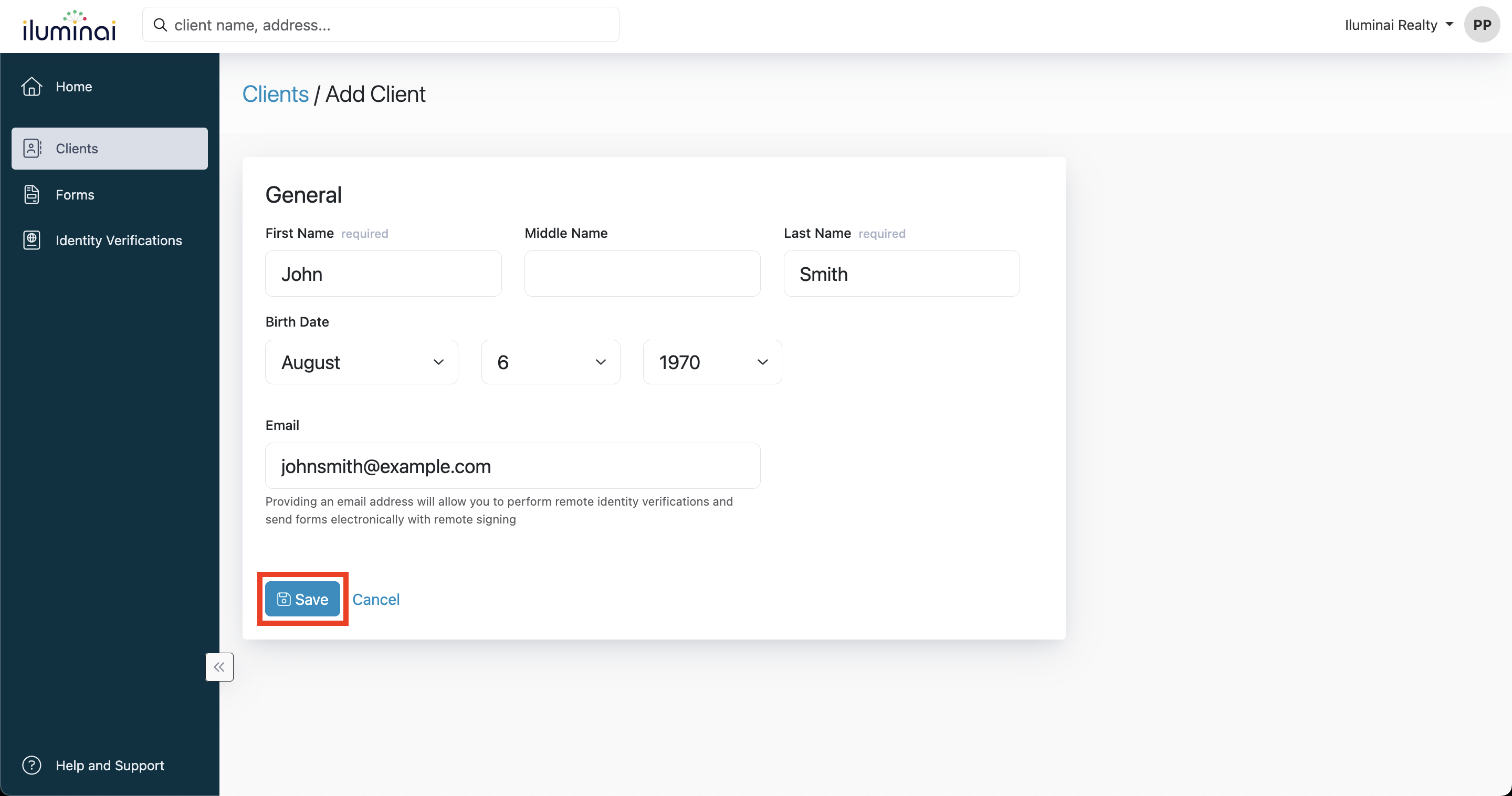 - Fill in your Client's information and click Save