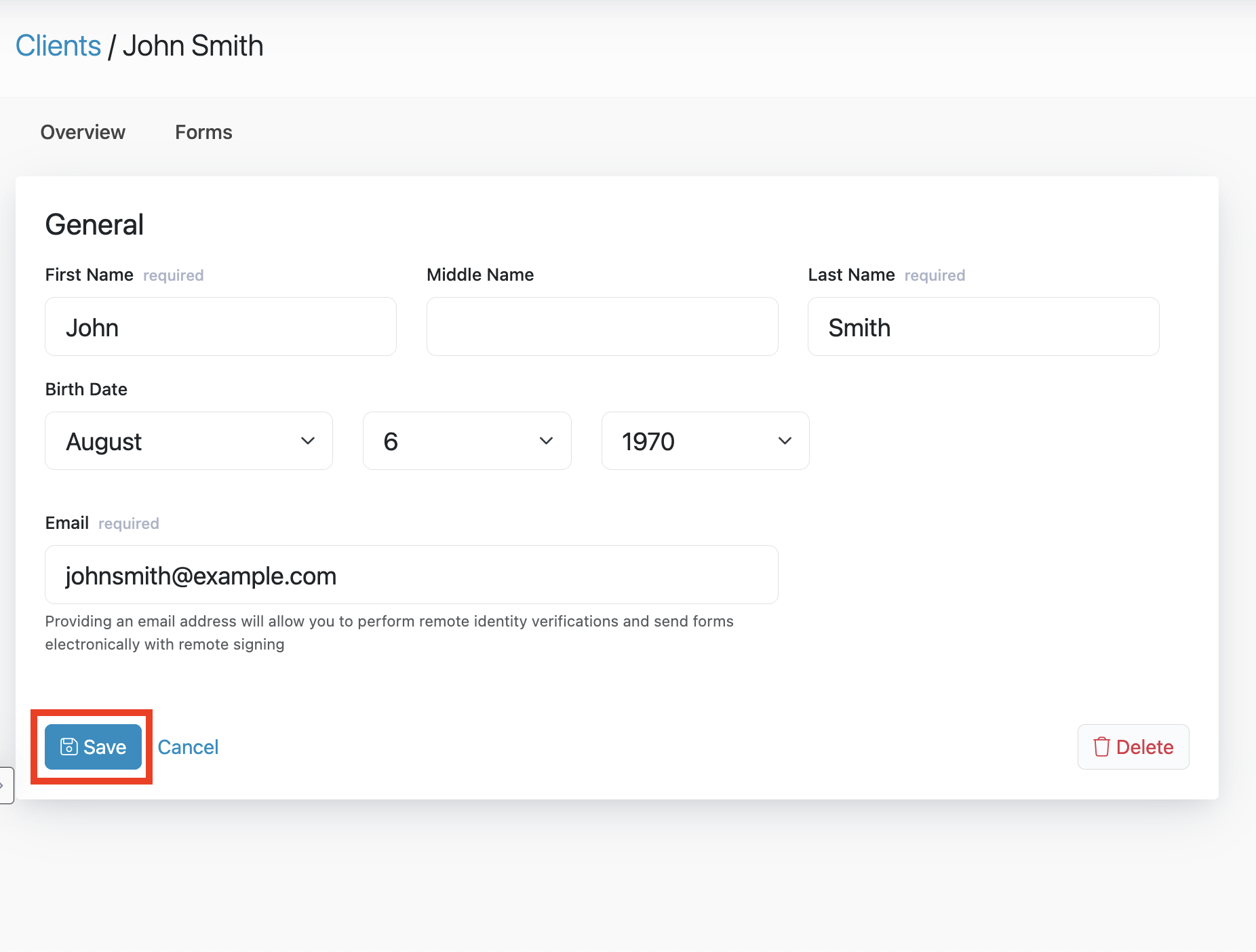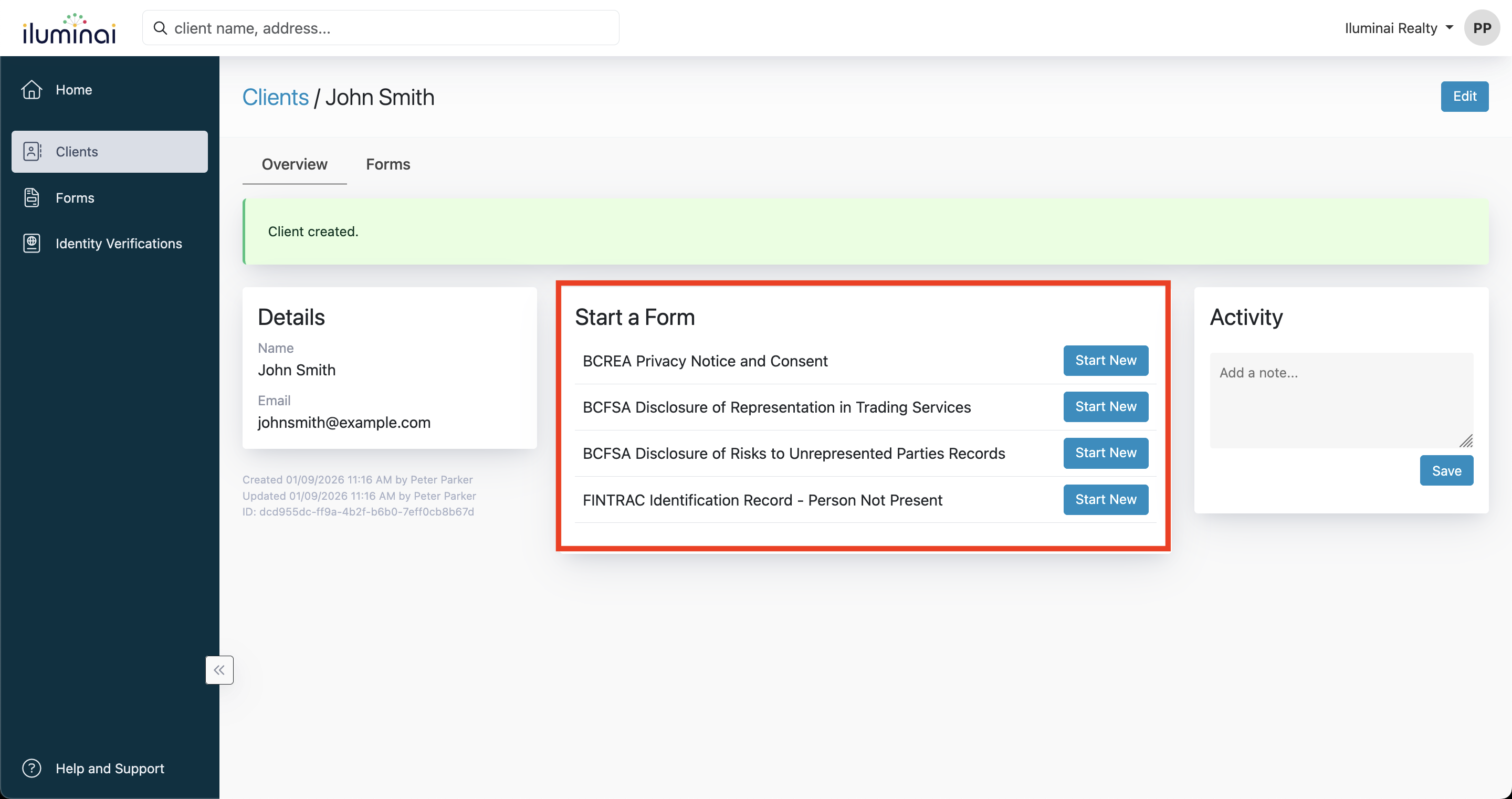 When you create a Client record, you can capture key details such as the Client's name, email address, and date of birth. After the Client is created, you can quickly start new forms directly from the Client's profile, keeping all form activity tied to the correct Client for easier tracking and follow-up.