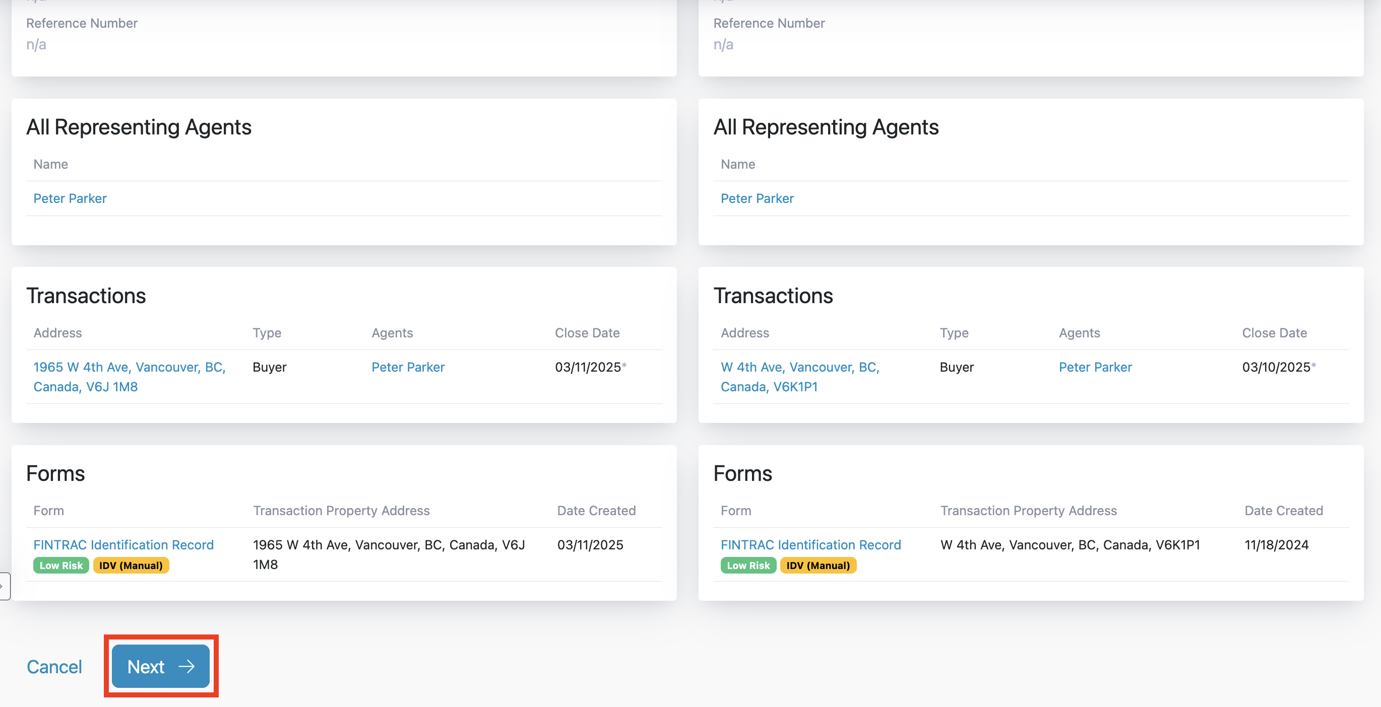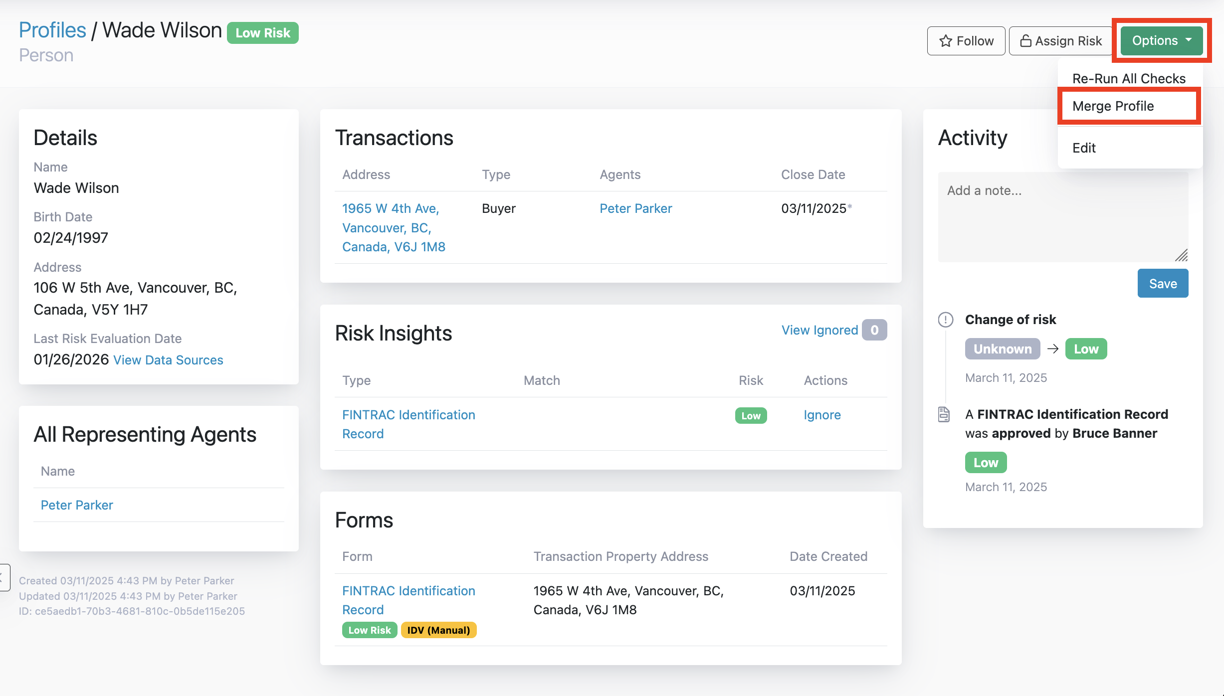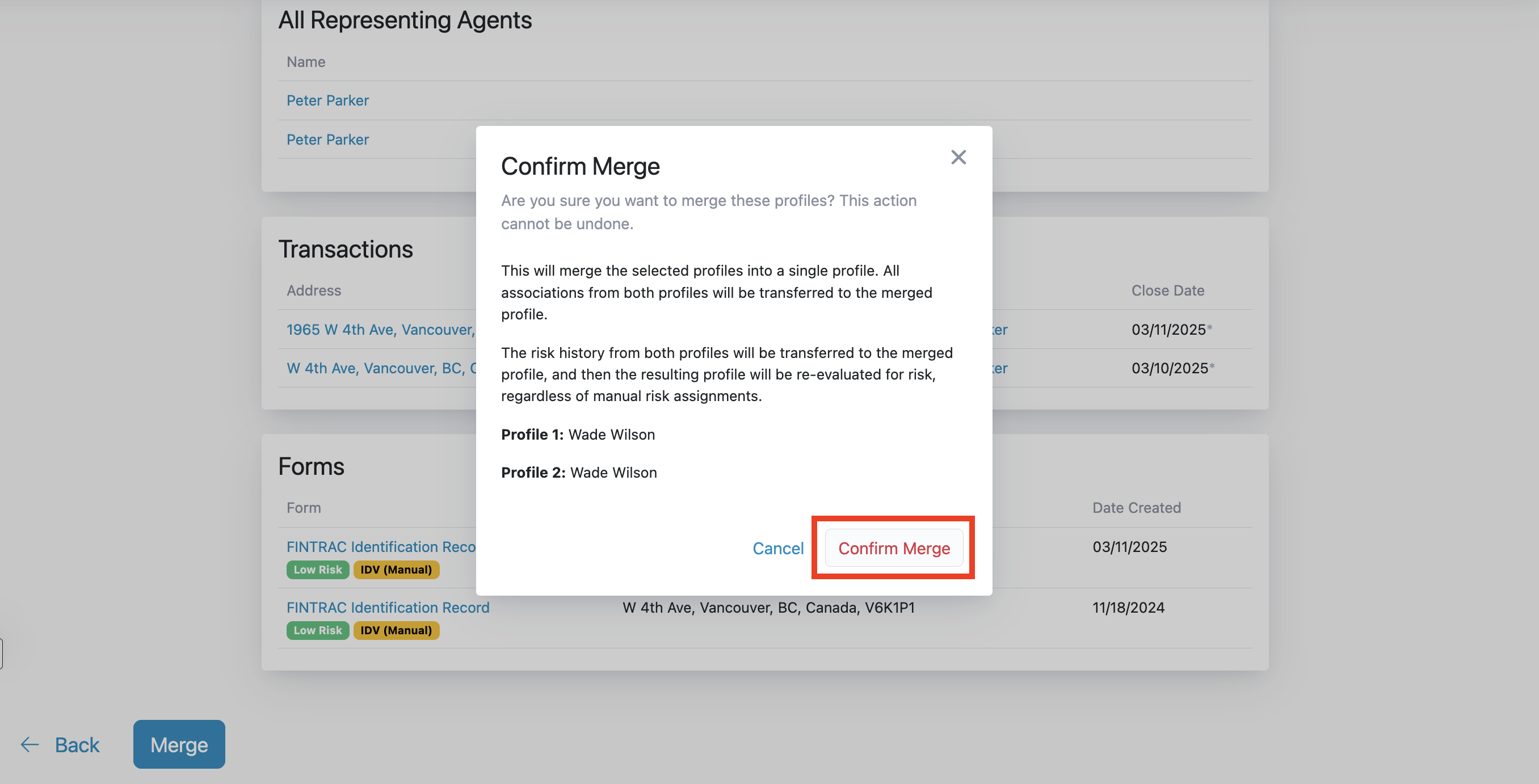 Merging two Profiles will consolidate all associated Transactions, Agents, Forms and Notes into a single Profile. During the merge, you can choose which attributes to keep from each Profile (such as name, date of birth, address, and other details). These selected values will be used for the resulting Profile.